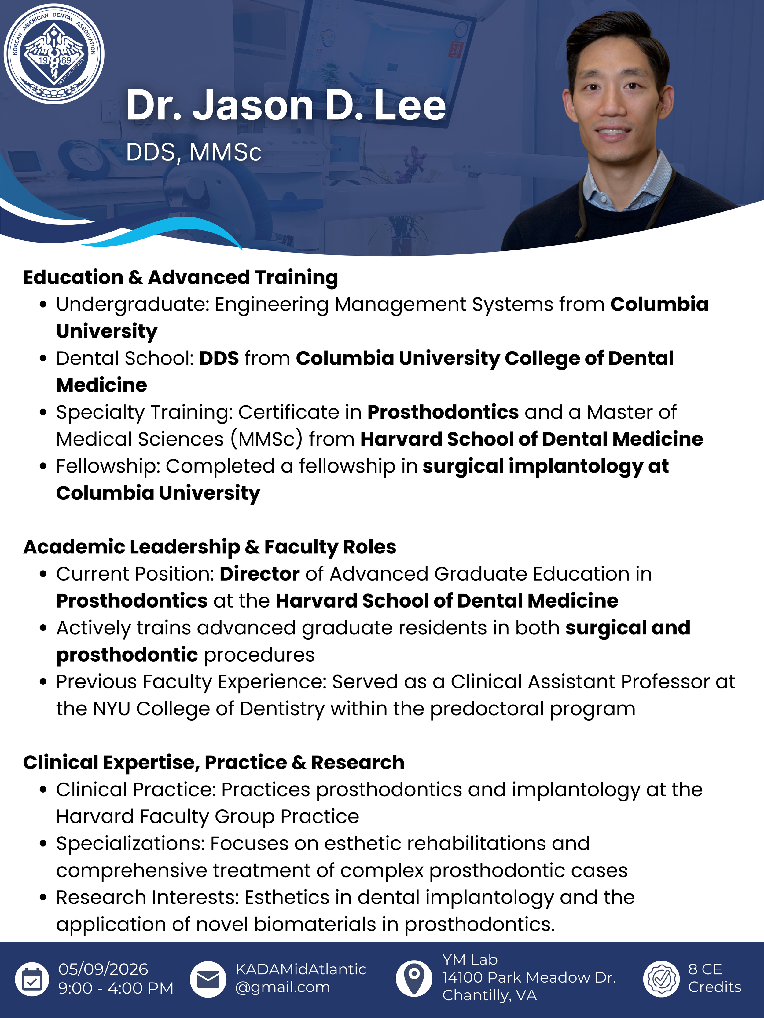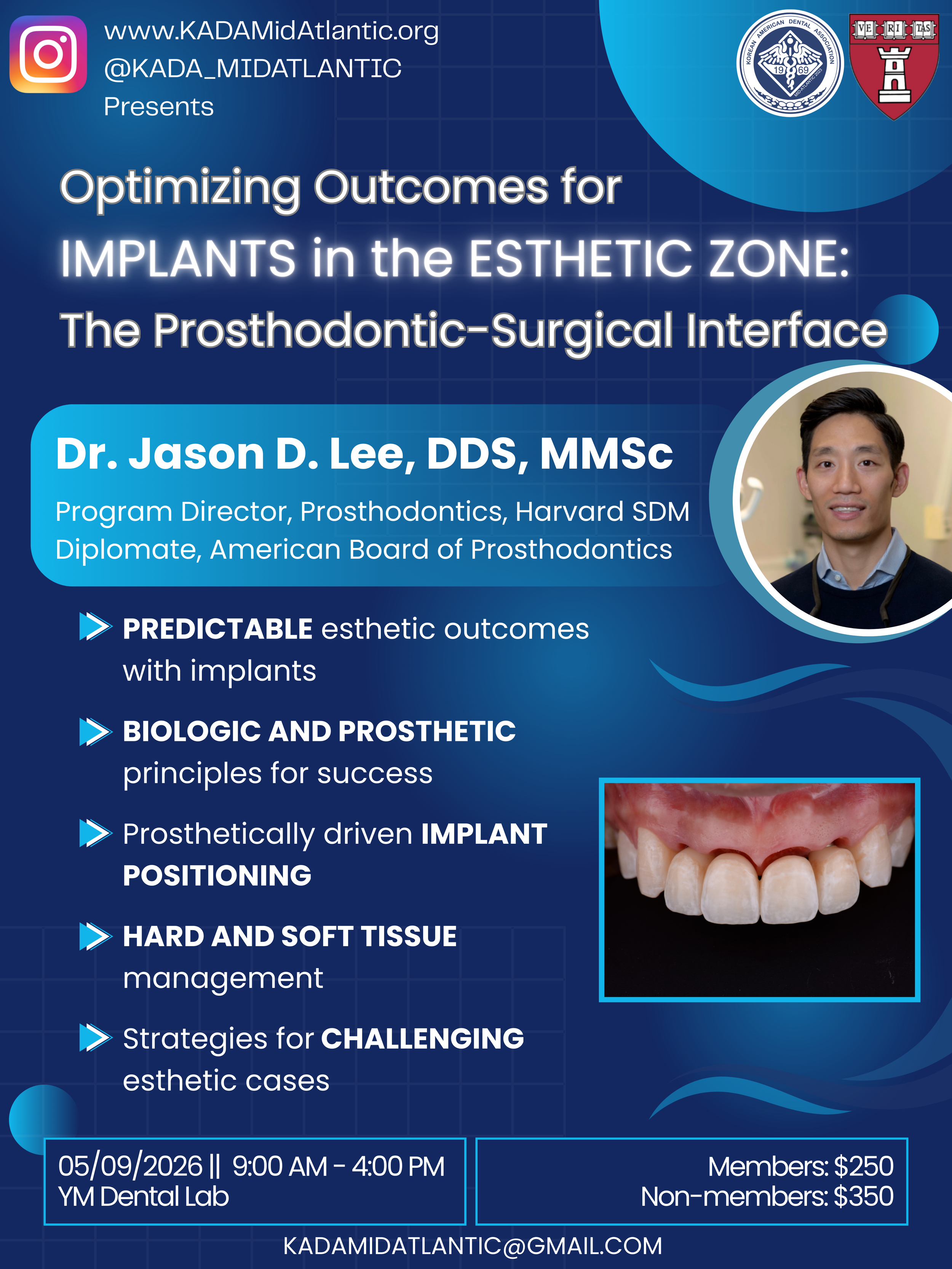 Join us for an in-depth continuing education seminar presented by Dr. Jason D. Lee, DDS, MMSc, Program Director of Prosthodontics at Harvard School of Dental Medicine. This course is designed for dental professionals seeking a deeper understanding of the prosthetically driven principles that guide implant placement, tissue management, and restoration in the esthetic zone.