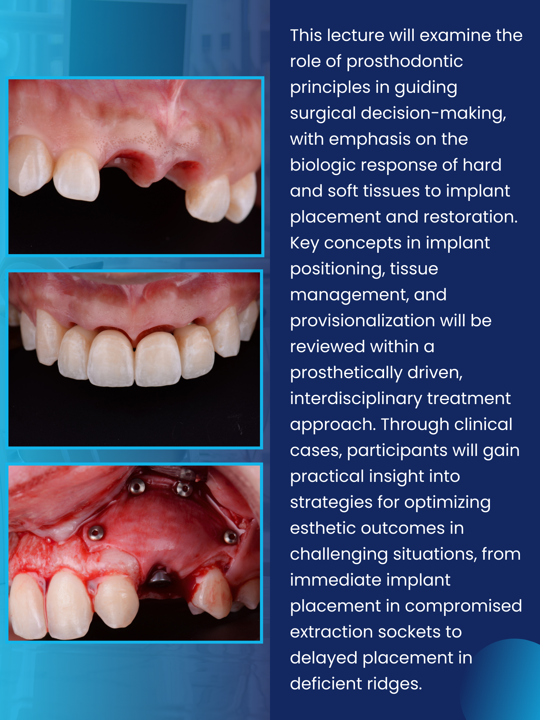 Through clinical cases and evidence-based discussion, participants will explore how interdisciplinary planning between prosthodontics and surgery can lead to more predictable esthetic outcomes and long-term peri-implant stability.